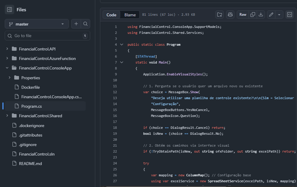 Sistema de automação financeira desenvolvido em C# para gerenciamento e processamento de dados financeiros.